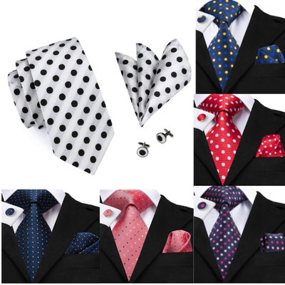 Add timeless charm to your formal wardrobe with the Classic Polka Dot Silk Men’s Tie Set. Designed with a refined woven texture and crisp dot pattern, this set delivers a sleek, sophisticated look suitable for business, weddings, and elegant events. Crafted for comfort and style, it pairs effortlessly with any suit, offering a polished appearance every time. Complete with a matching pocket square and cufflinks, it makes the perfect finishing touch for men who appreciate classic fashion.