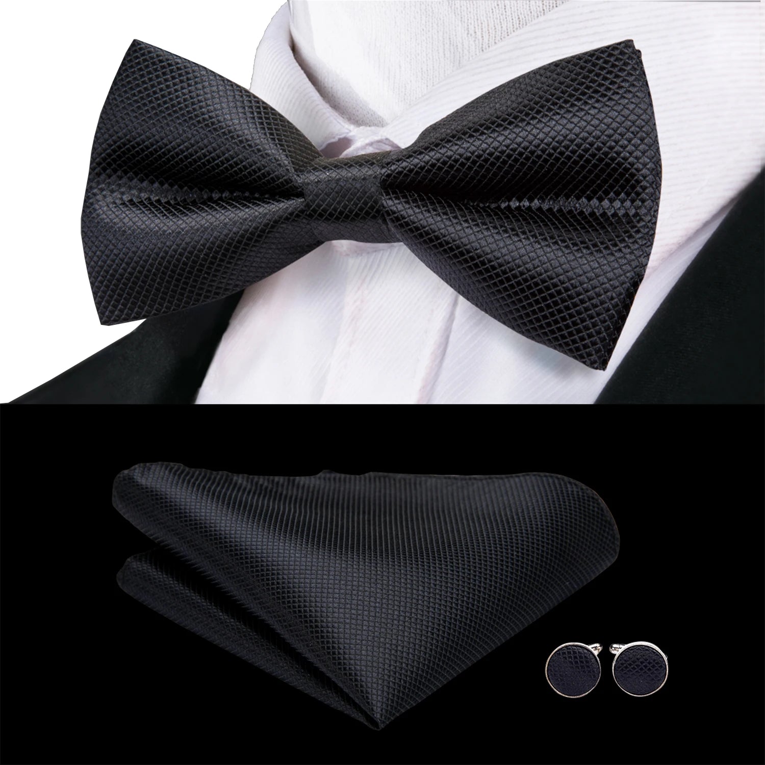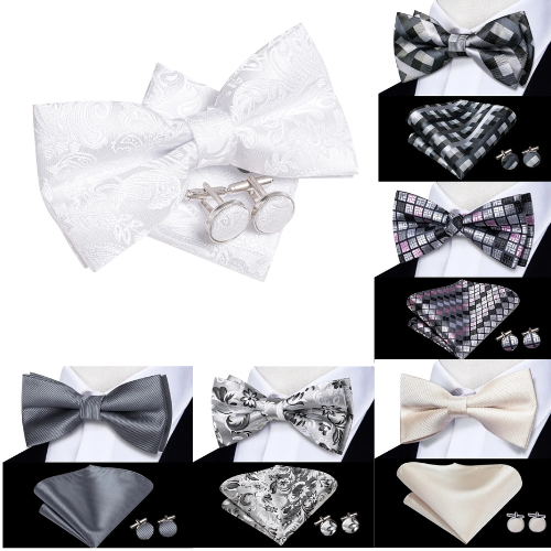 Elevate your formal style with the Silver & Black Formal Bow Tie Gift Set — a refined collection designed for weddings, business events, and elegant celebrations. Featuring a pre-tied butterfly bow tie, matching pocket square, and coordinating cufflinks, this set offers a complete and polished look with minimal effort. The woven floral texture adds depth and sophistication, making it an ideal accessory for tuxedos and suits alike.
