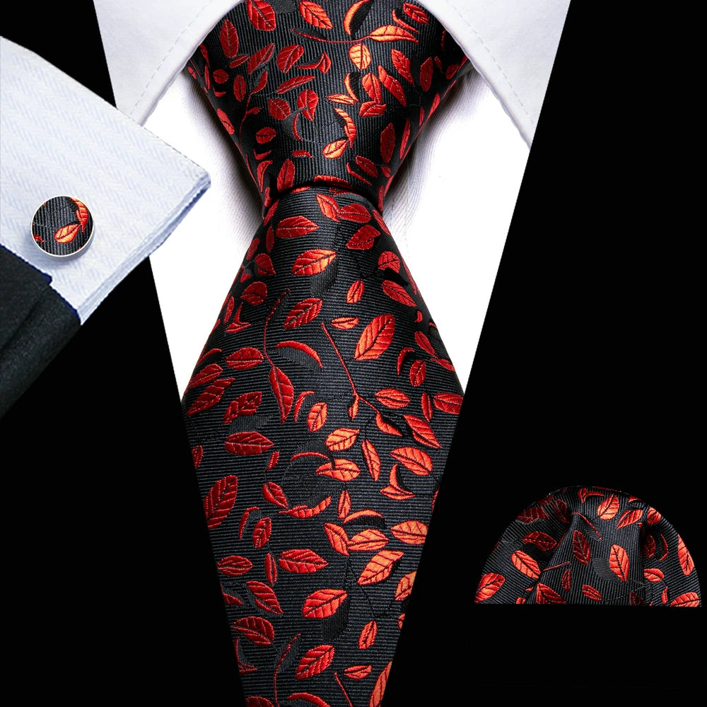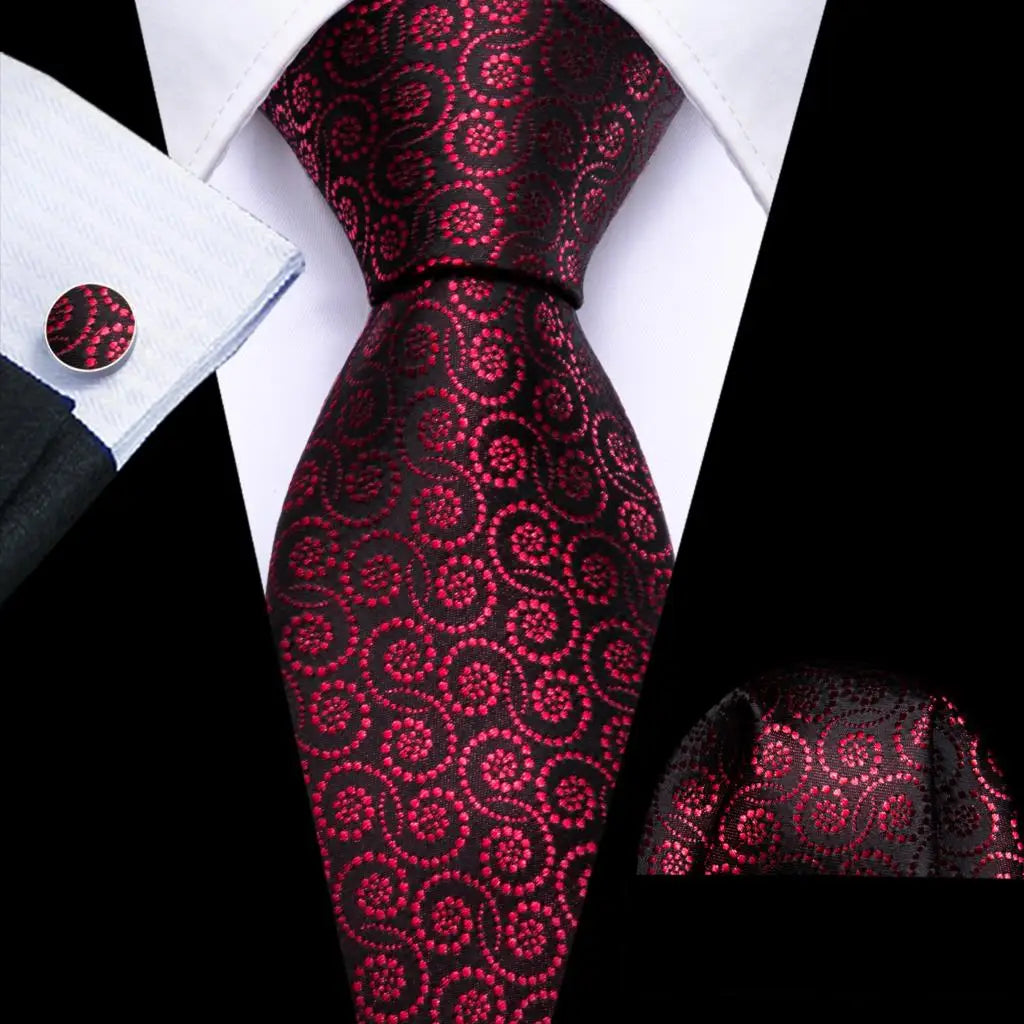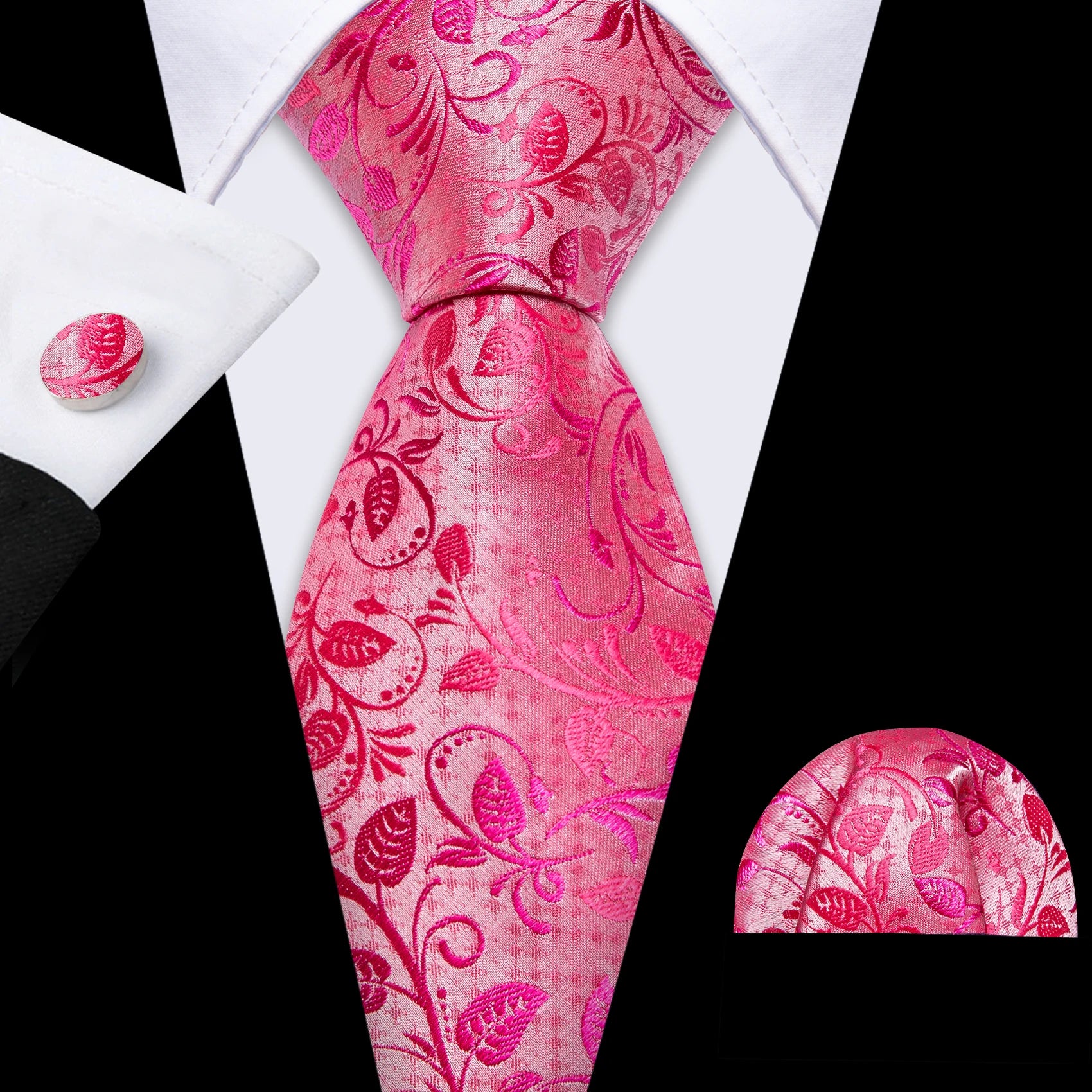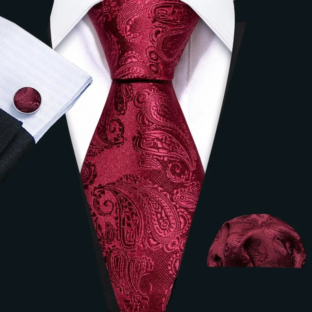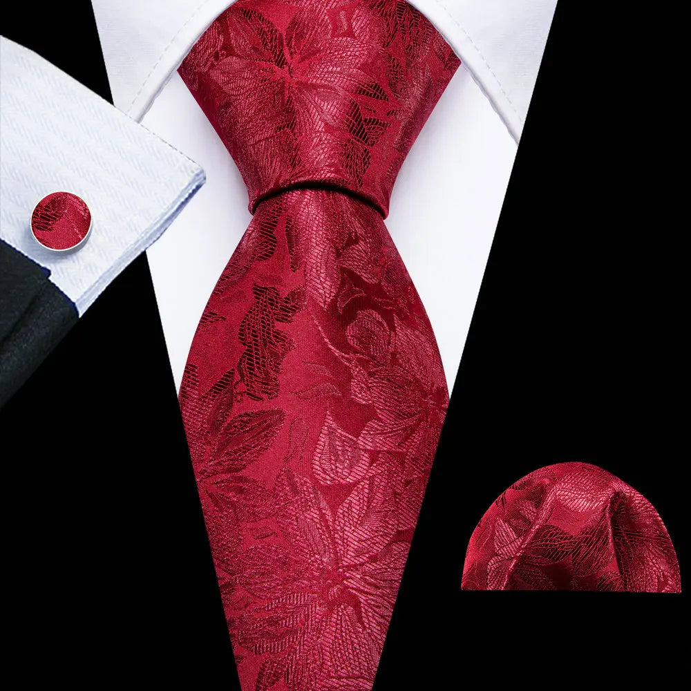 This set includes a silk-blend jacquard necktie, a matching pocket square, and coordinating cufflinks—perfectly crafted for weddings, formal occasions, or business attire. The rich tones of red, maroon, burgundy, and rose add a luxurious finish to your outfit, while the detailed floral pattern reflects the brand’s dedication to refined design.