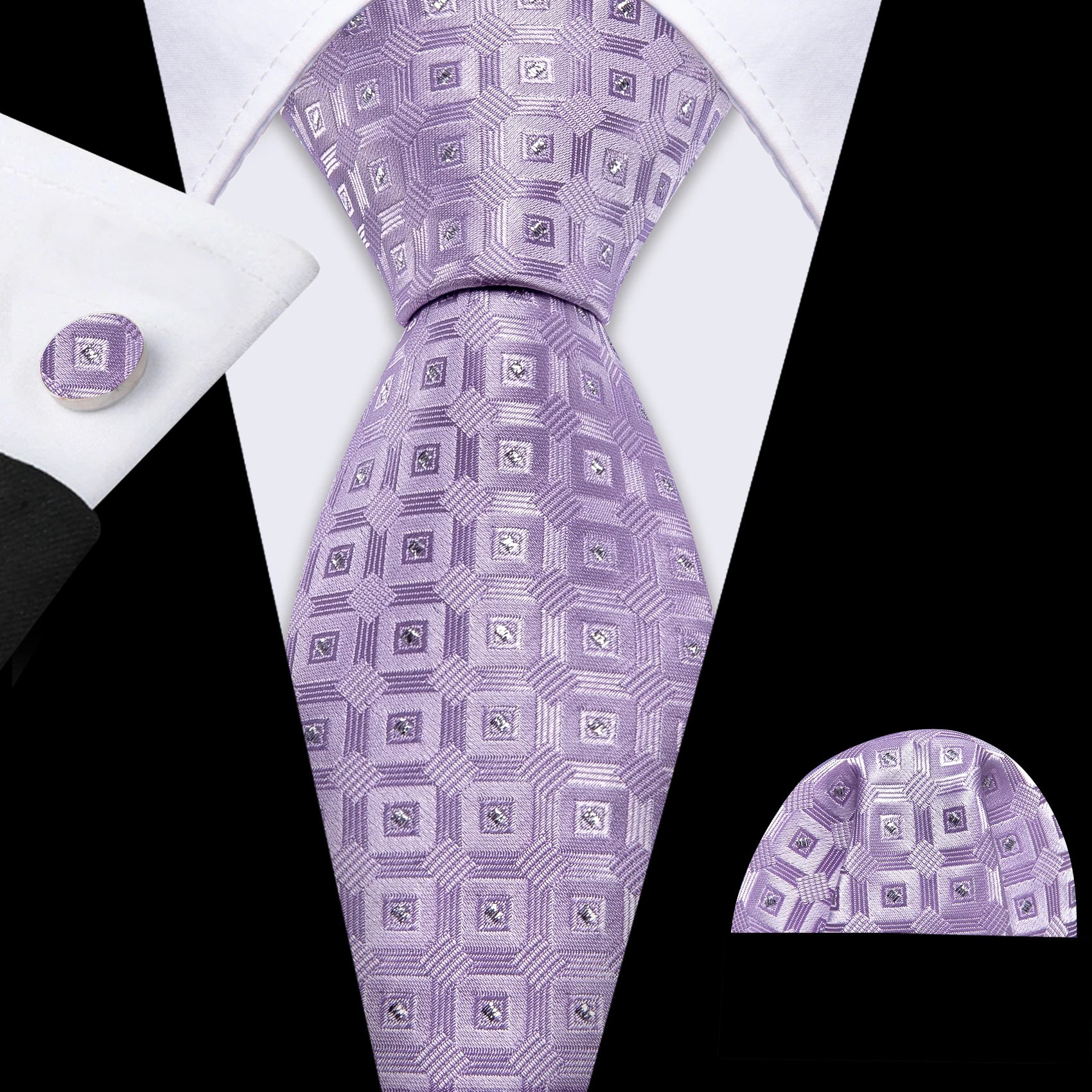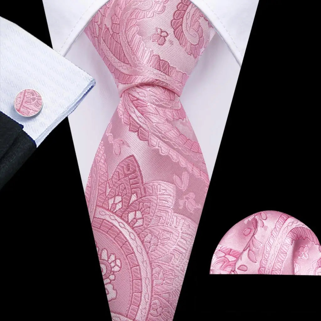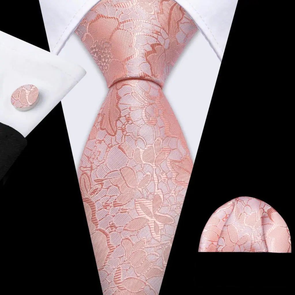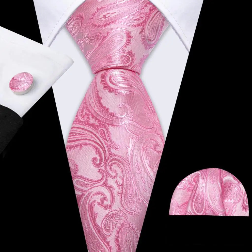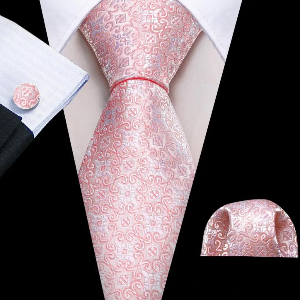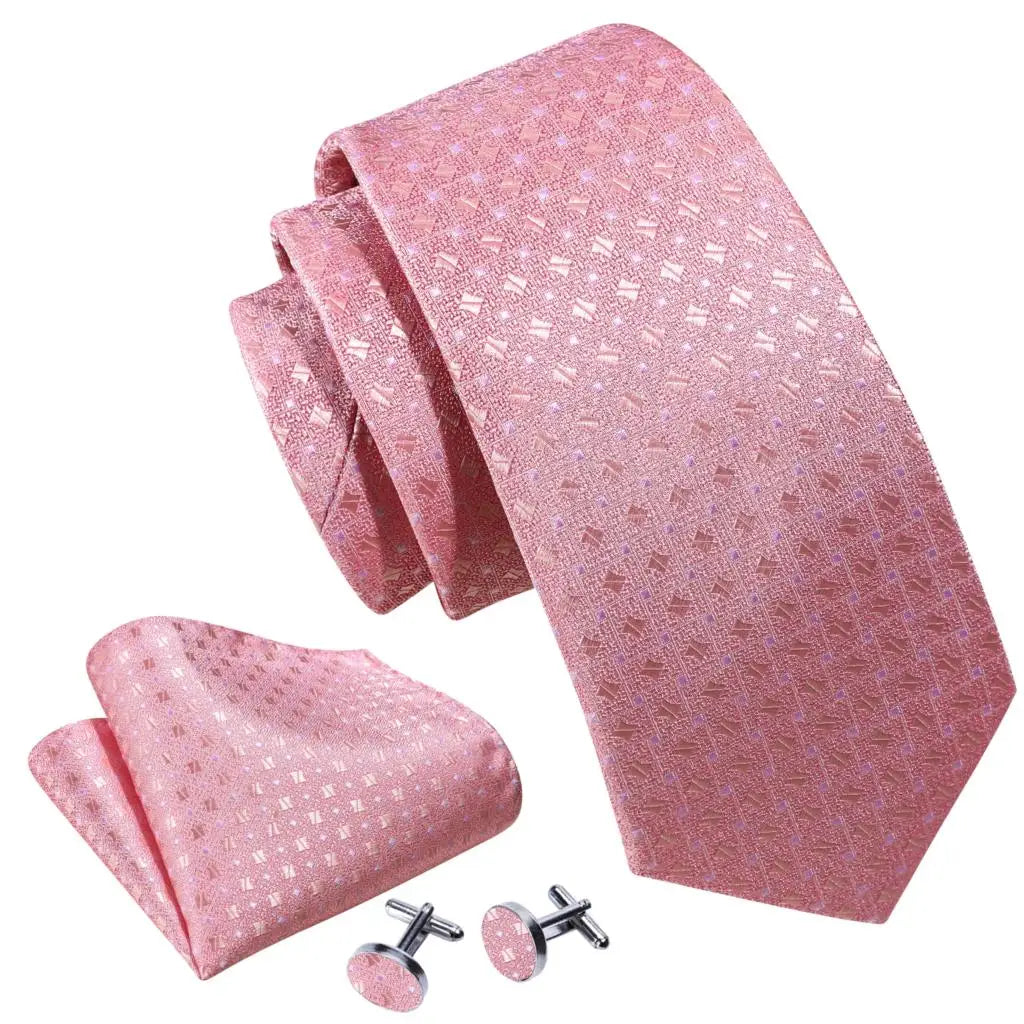Arrived quickly and safely, just as described. Beautiful pattern, quality fabric, easy to tie and untie. I don't use cufflinks but they seem to be of good quality; hardware has no rough edges and mechanism is tight but not stiff. Pocket square beautiful. Great value, i recommend the product and seller.