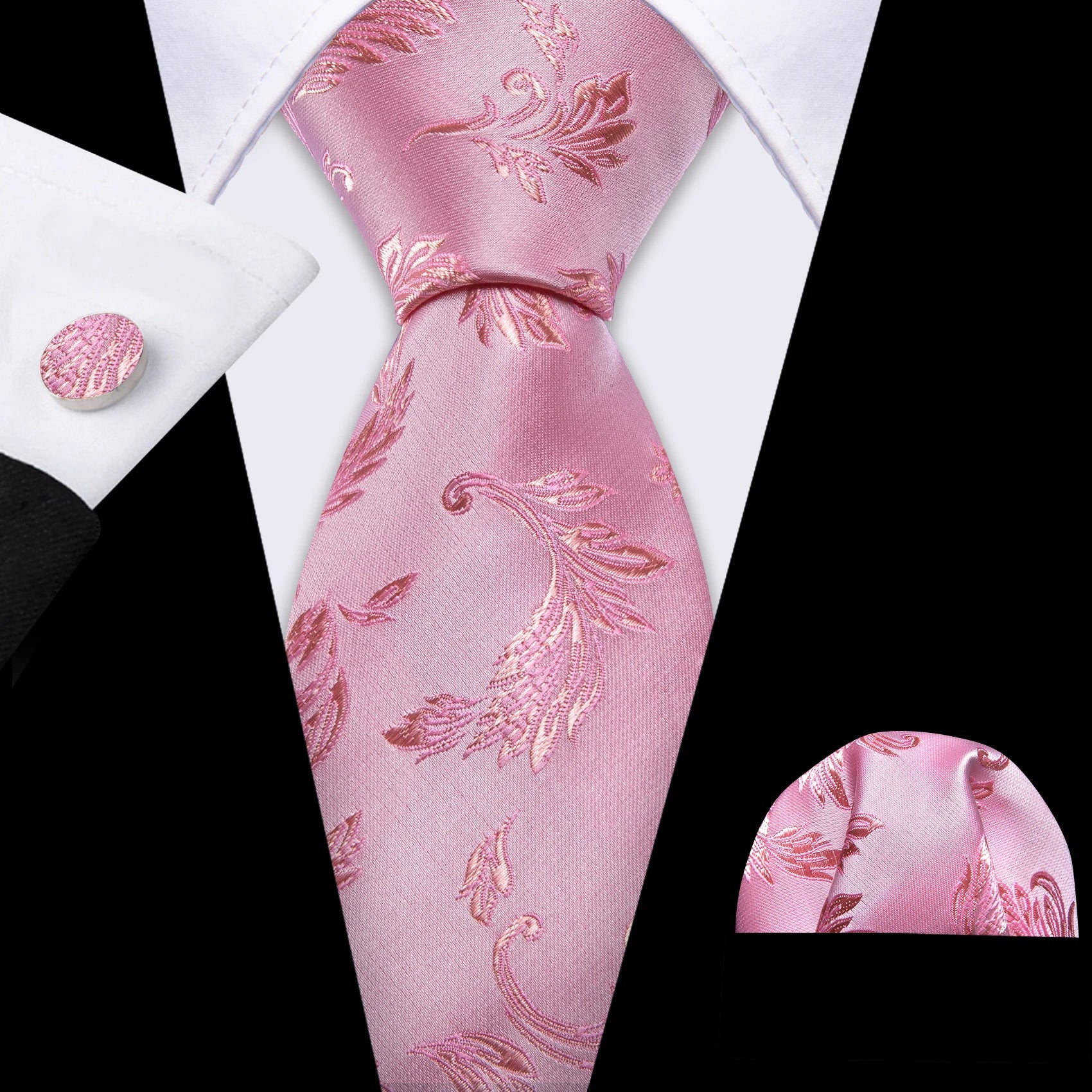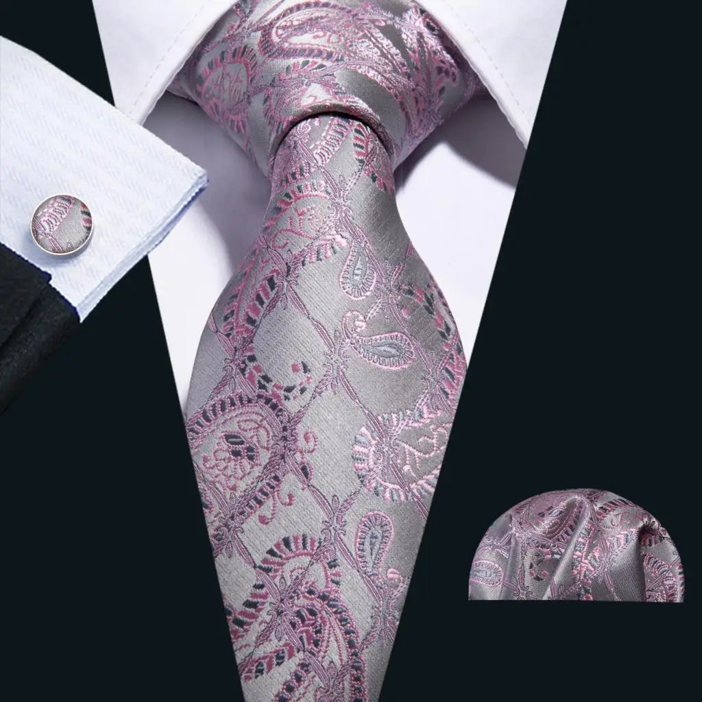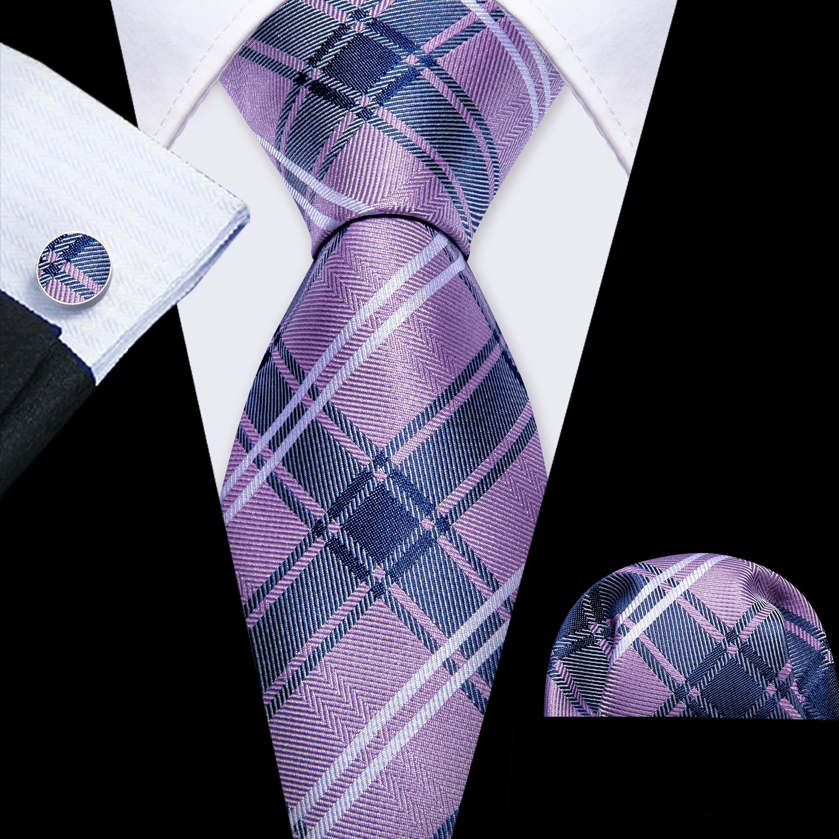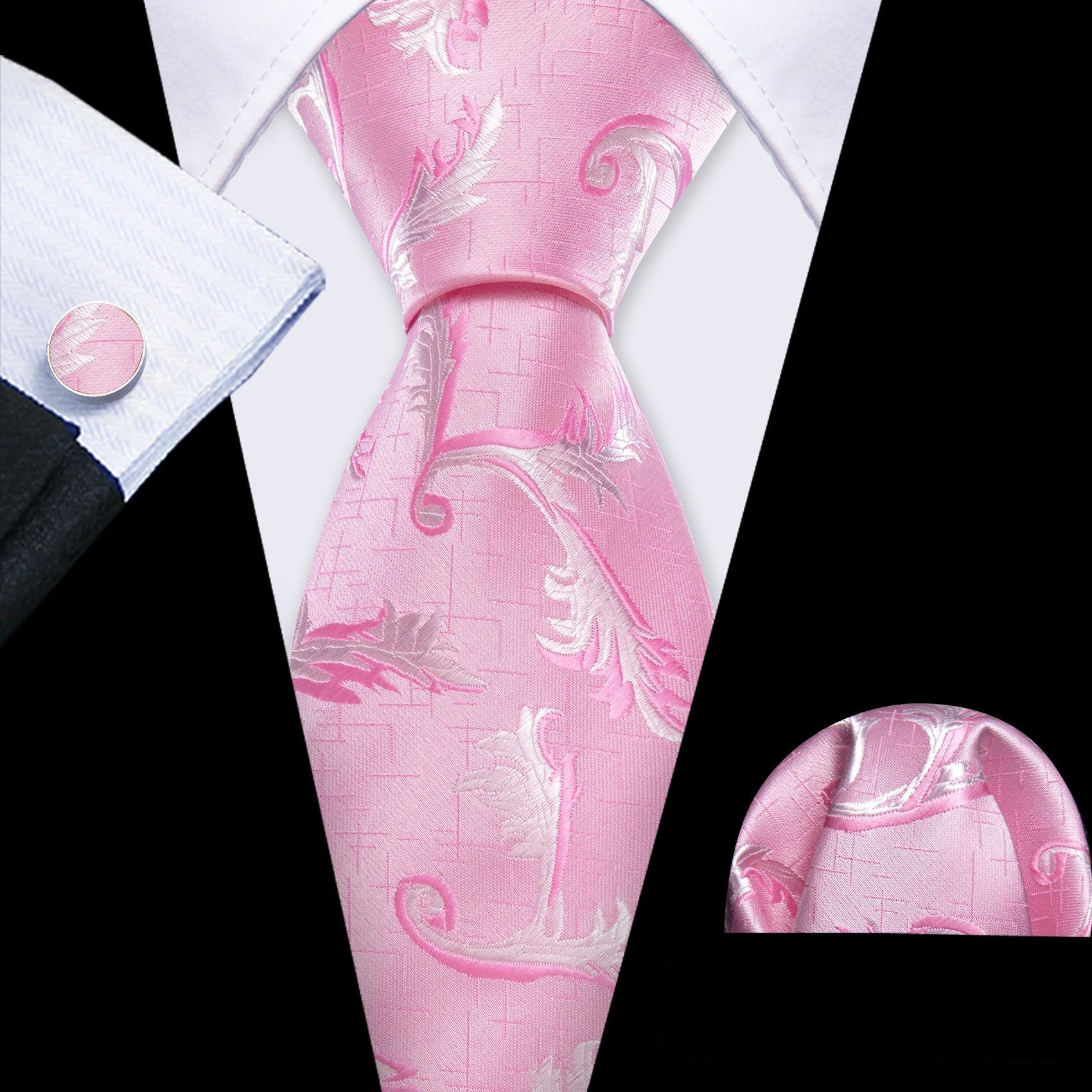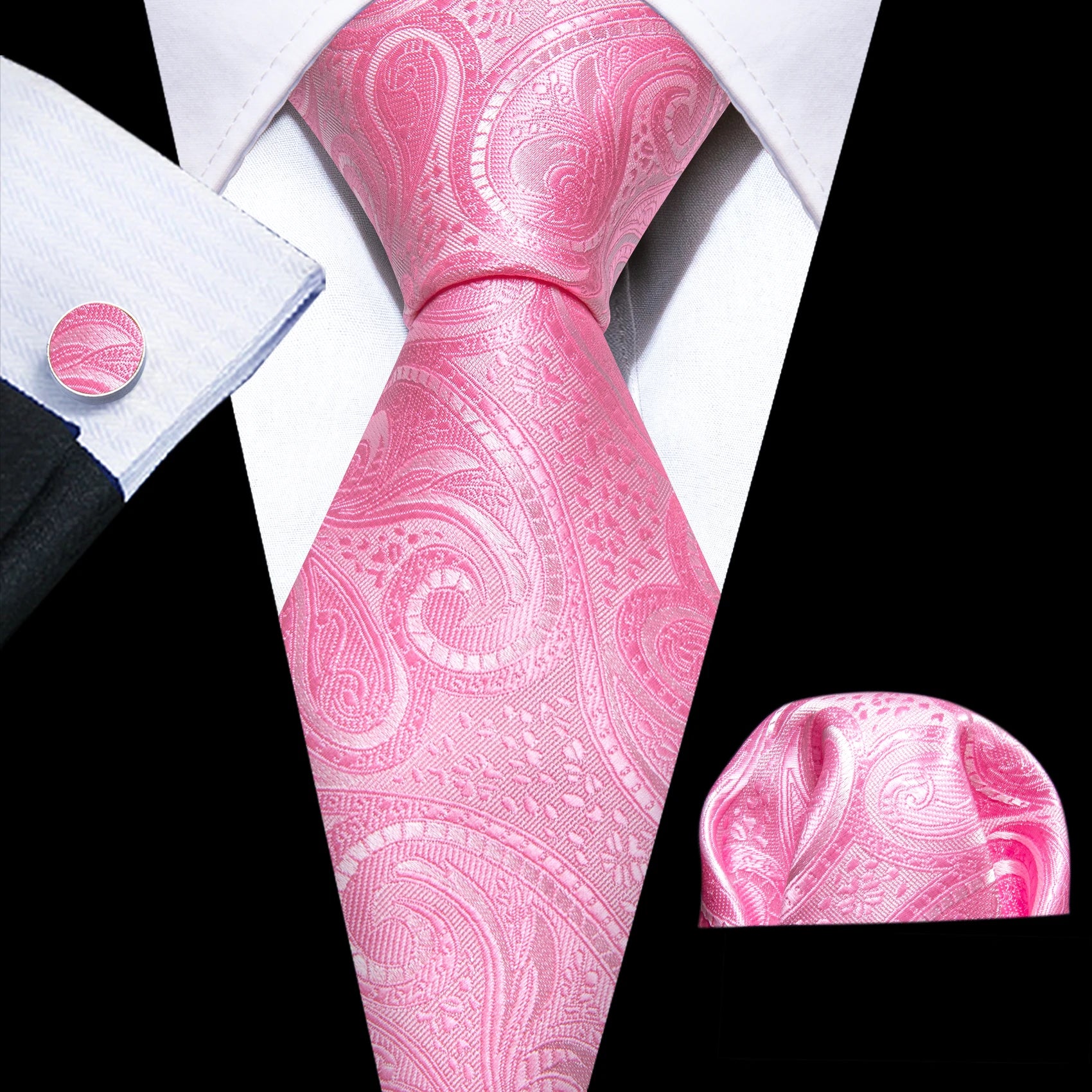 Arrived quickly and safely, just as described. Beautiful pattern, quality fabric, easy to tie and untie. I don't use cufflinks but they seem to be of good quality; hardware has no rough edges and mechanism is tight but not stiff. Pocket square beautiful. Great value, i recommend the product and seller.