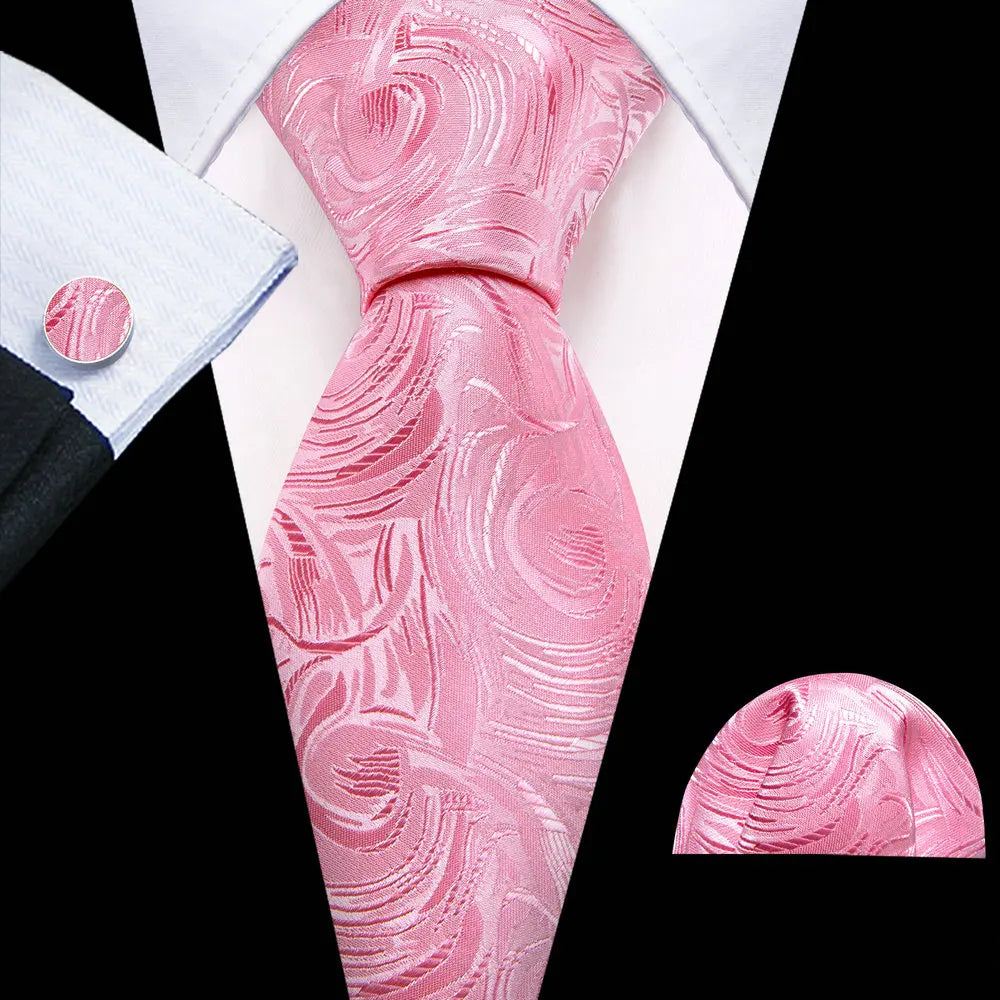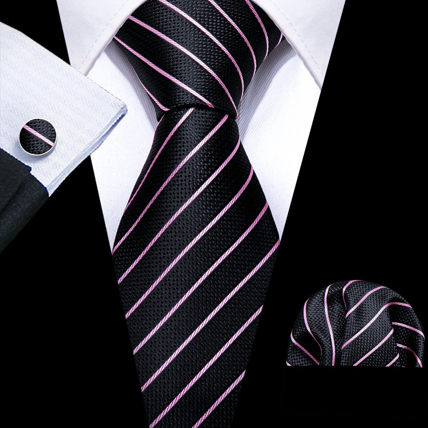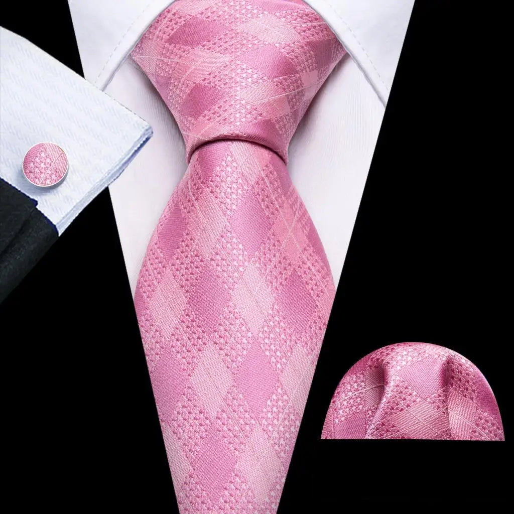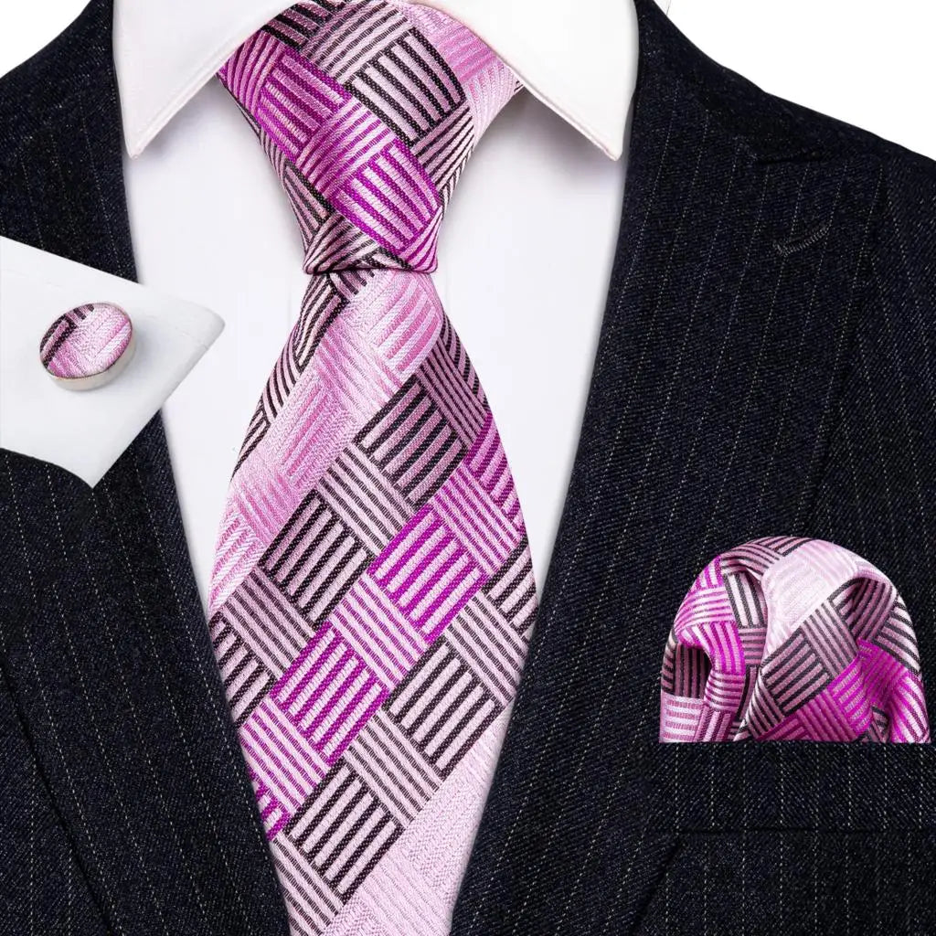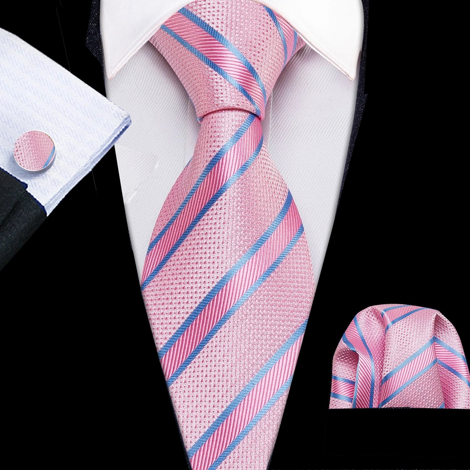 Arrived quickly and safely, just as described. Beautiful pattern, quality fabric, easy to tie and untie. I don't use cufflinks but they seem to be of good quality; hardware has no rough edges and mechanism is tight but not stiff. Pocket square beautiful. Great value, i recommend the product and seller.