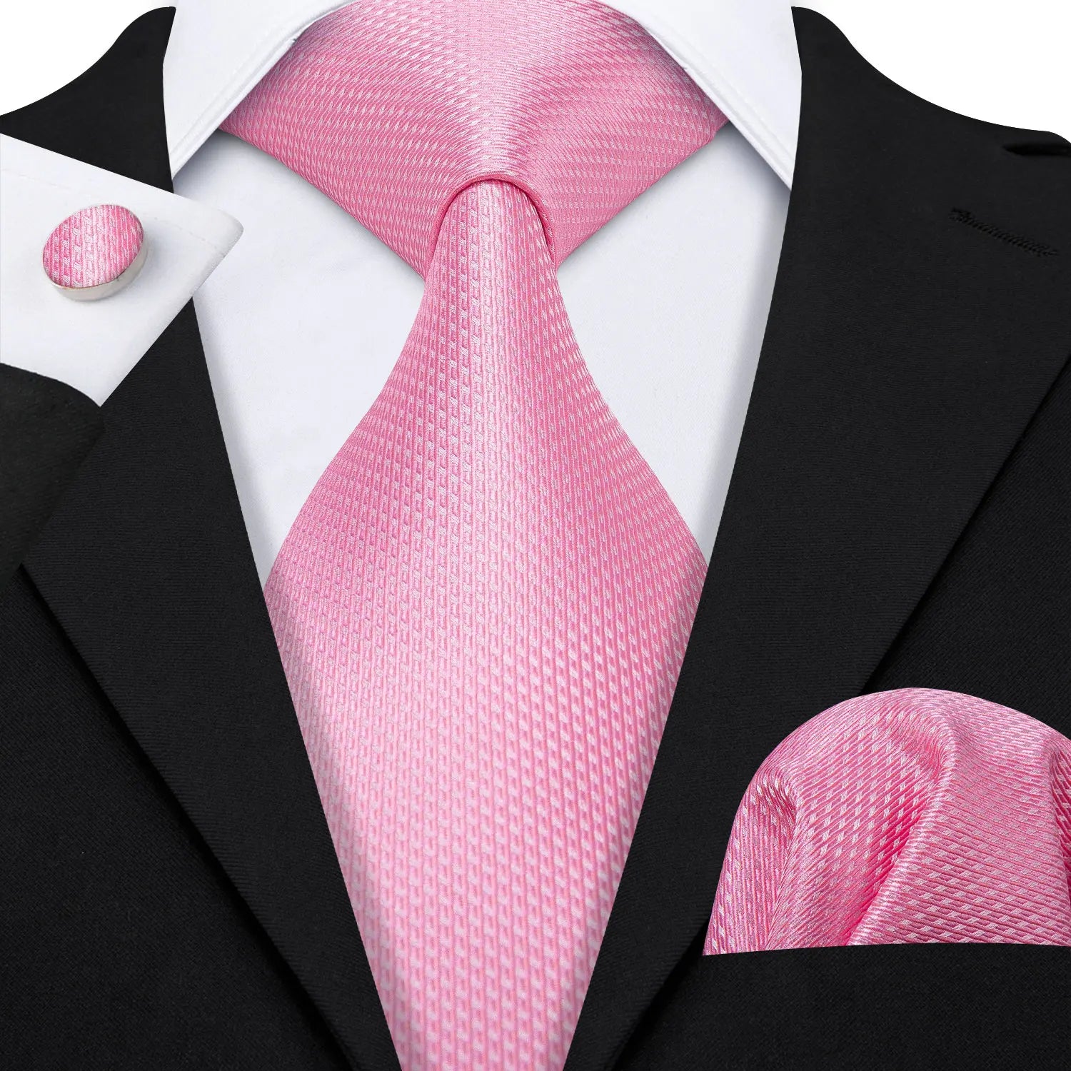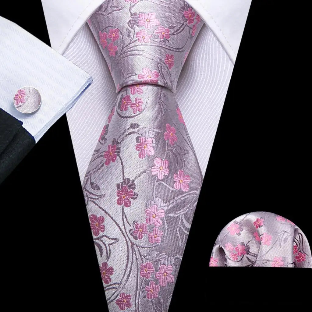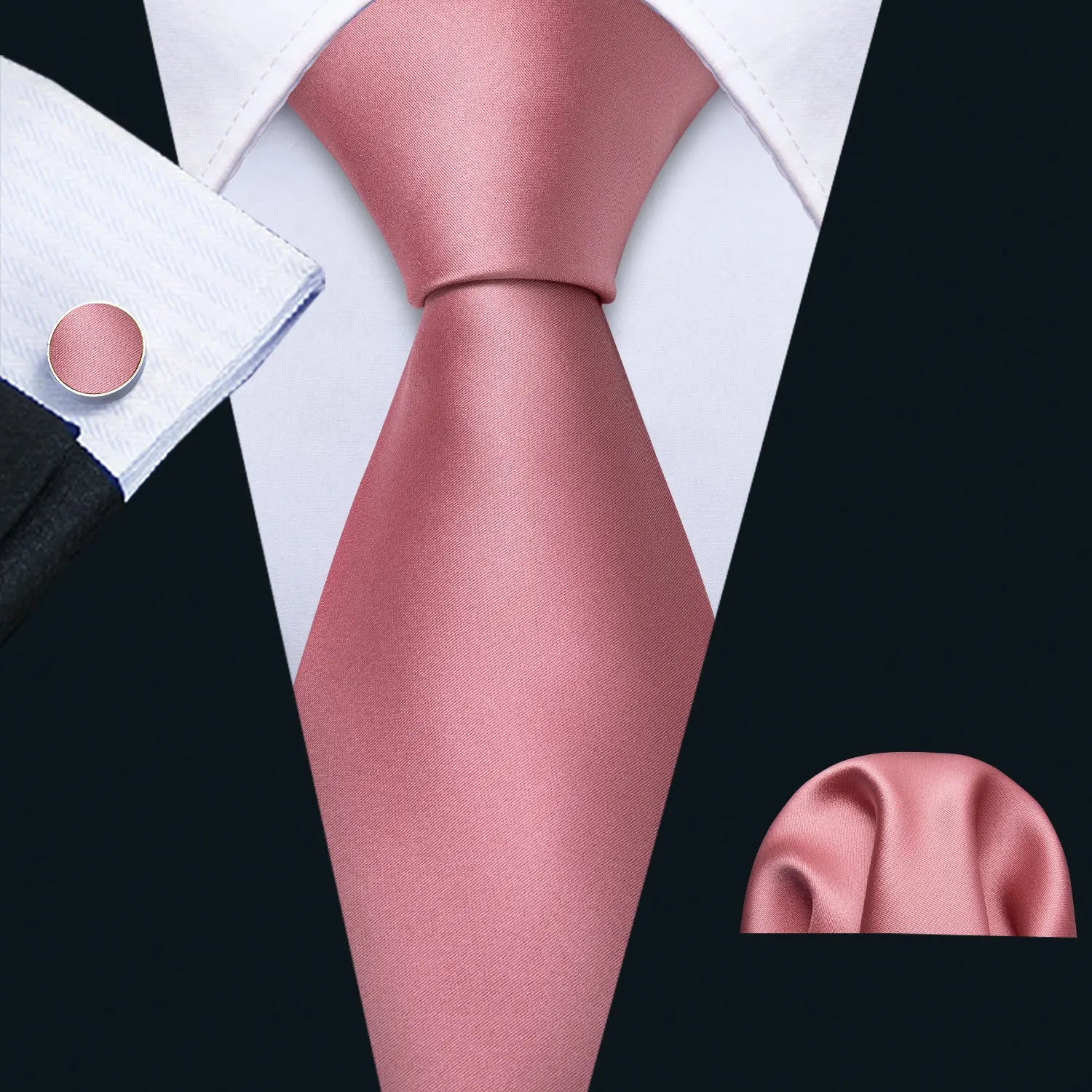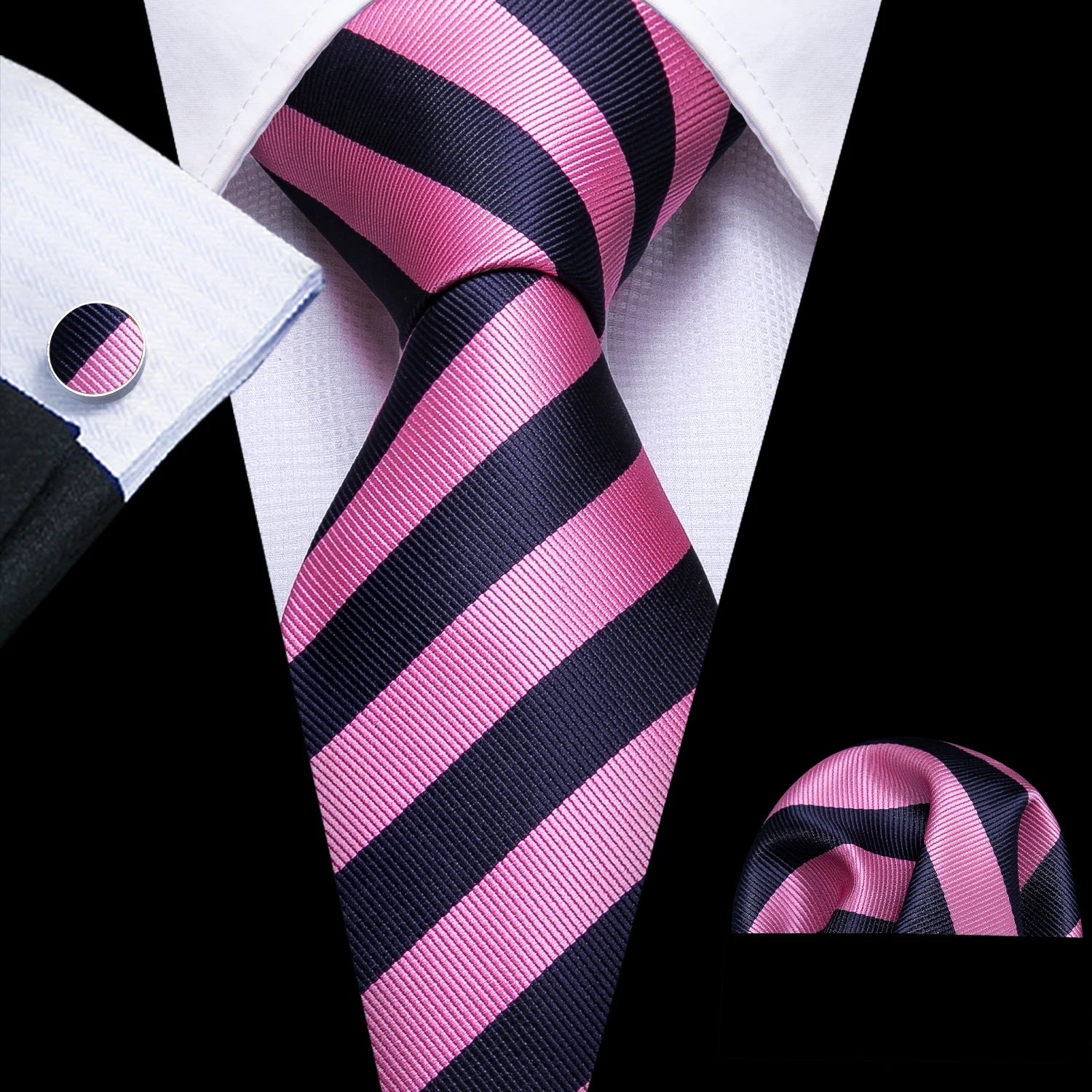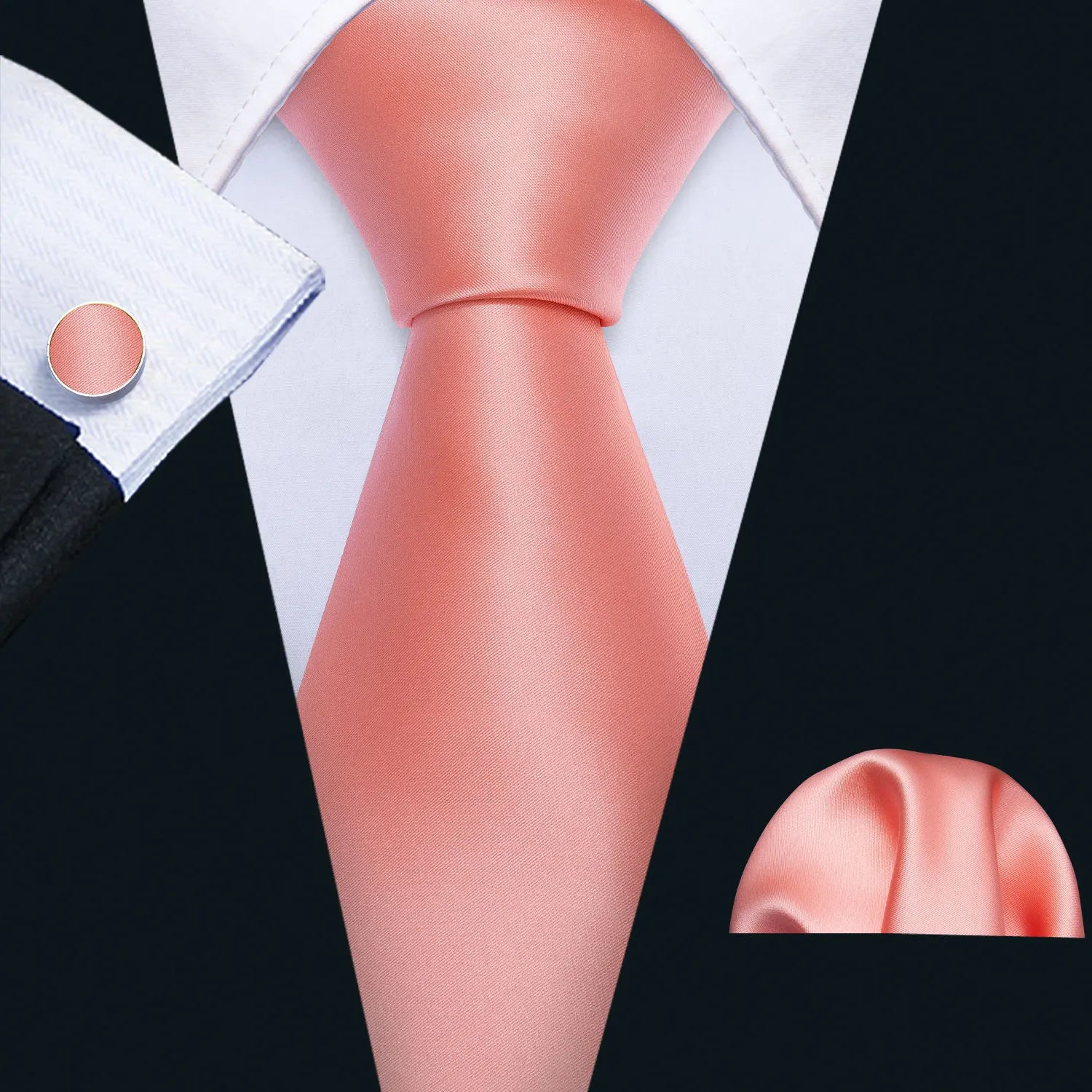 Arrived quickly and safely, just as described. Beautiful pattern, quality fabric, easy to tie and untie. I don't use cufflinks but they seem to be of good quality; hardware has no rough edges and mechanism is tight but not stiff. Pocket square beautiful. Great value, i recommend the product and seller.