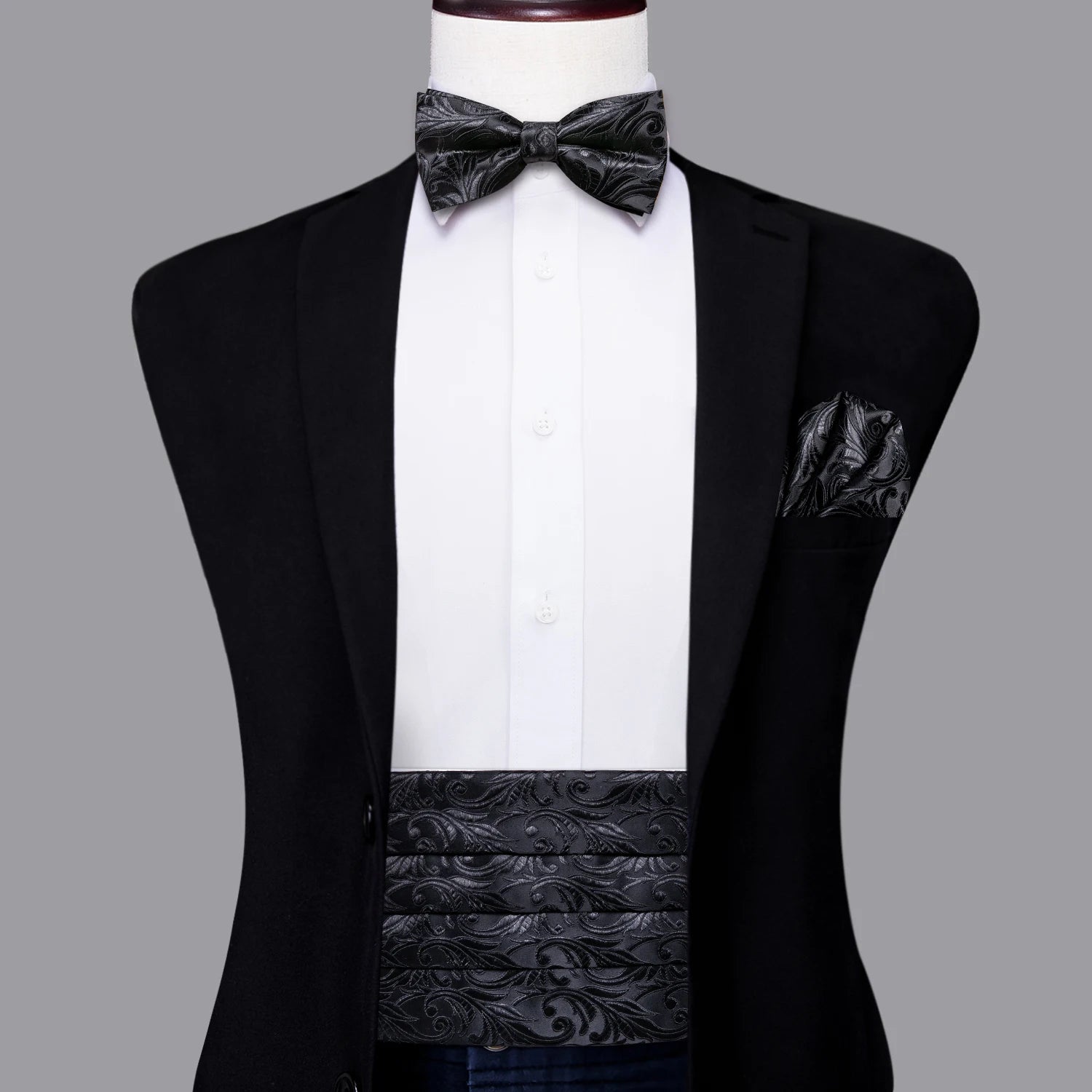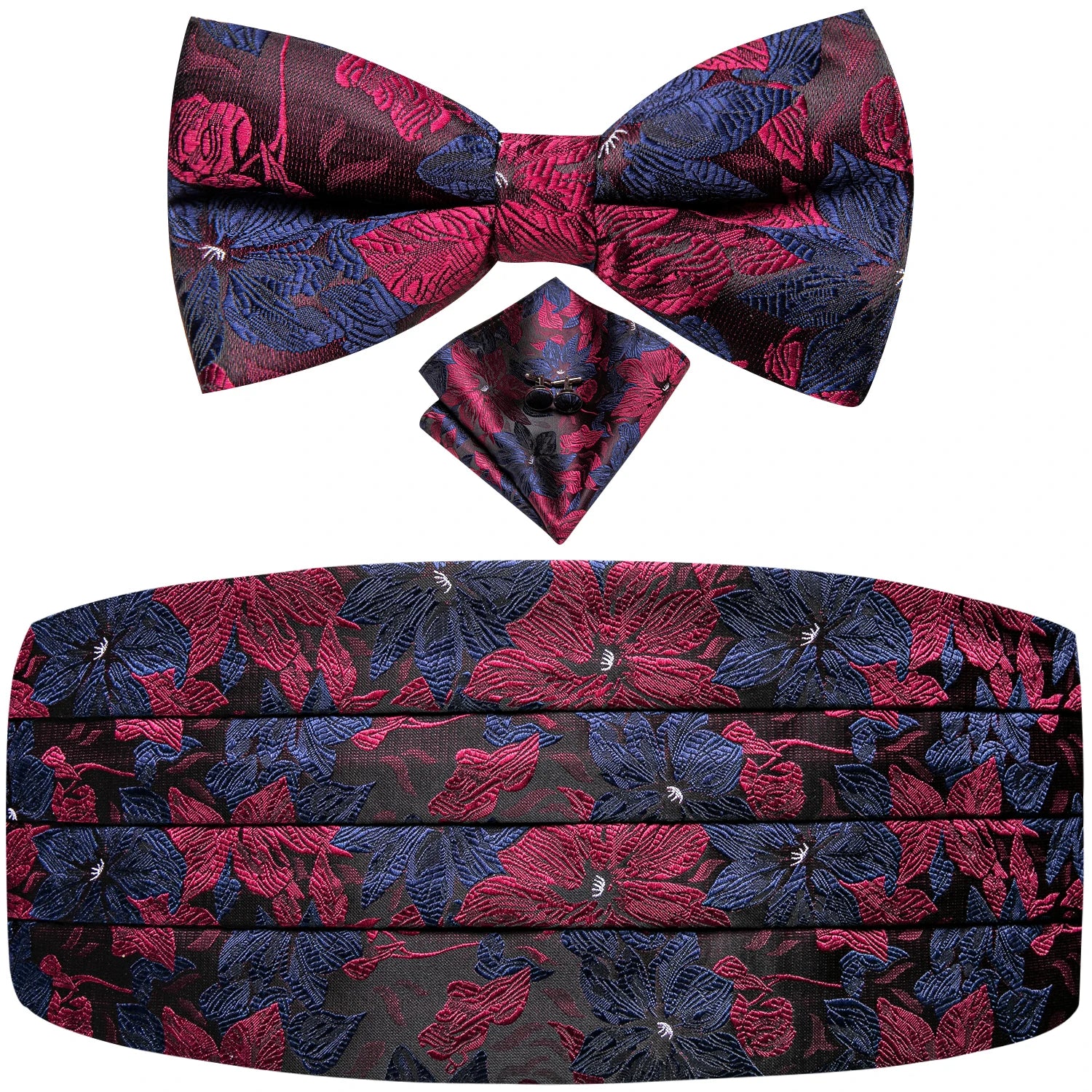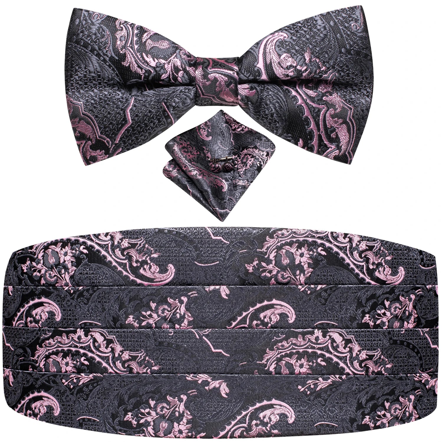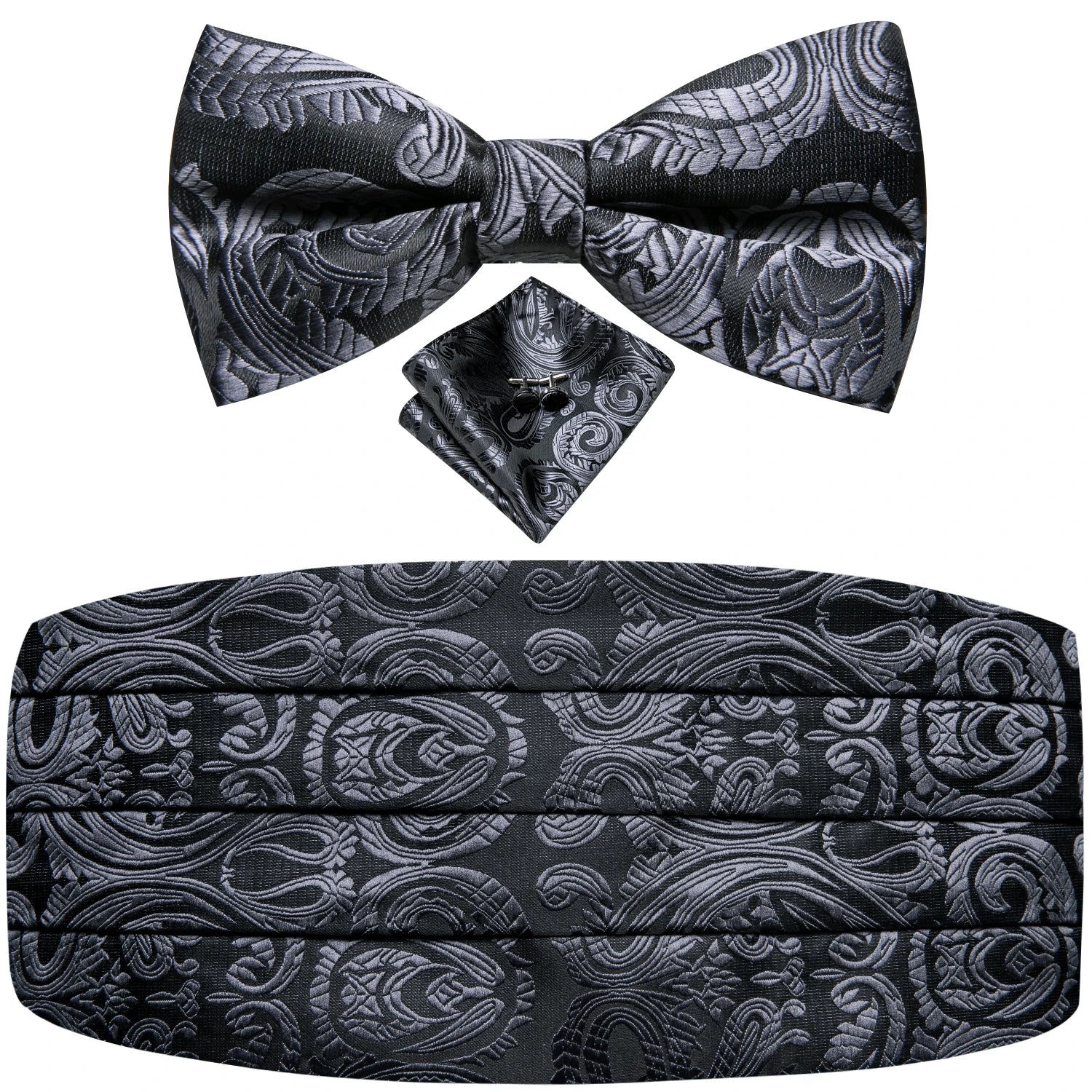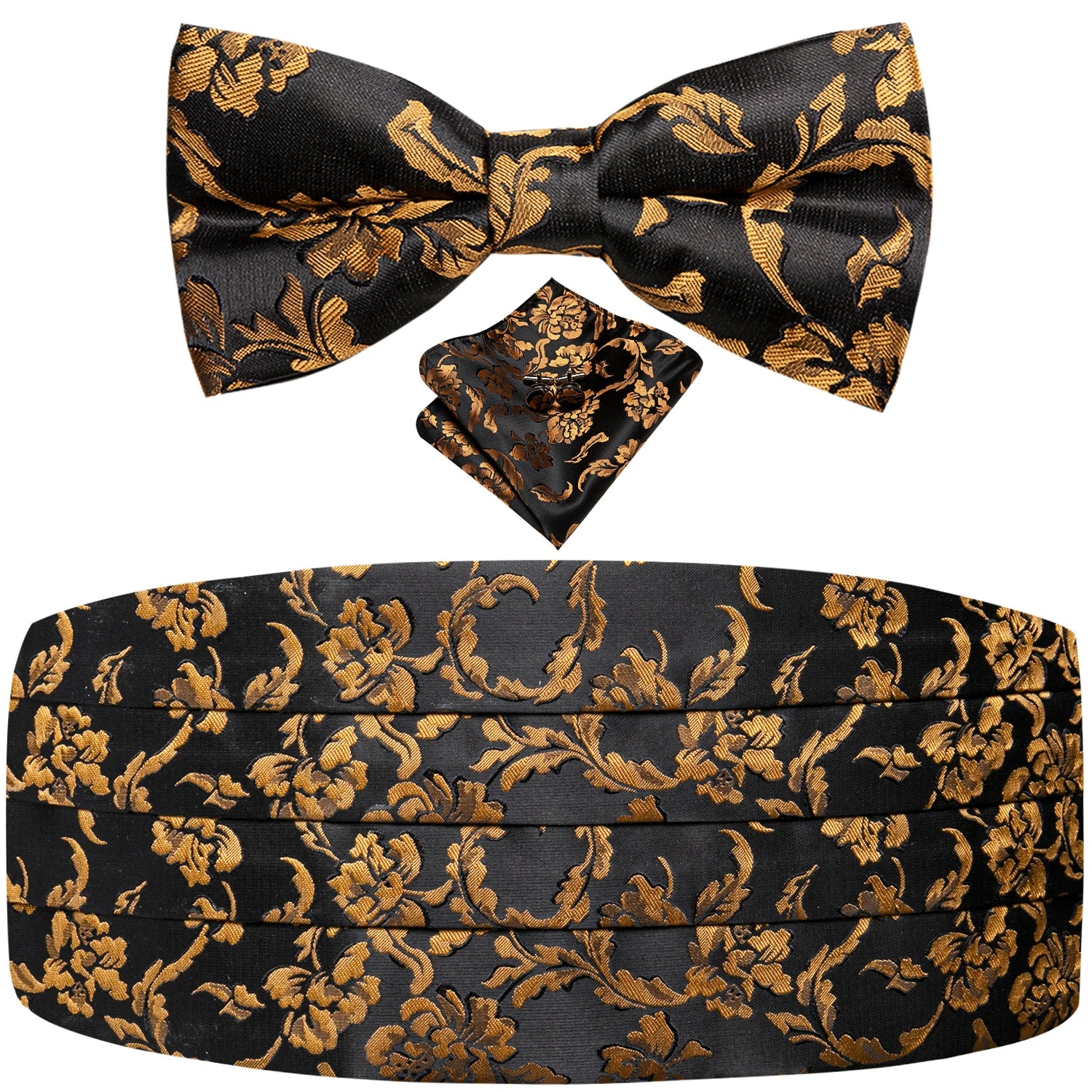 Upgrade your formal ensemble with the Black Vintage Floral Cummerbund & Bow Tie Set — a refined accessory collection designed to bring timeless elegance to weddings, galas, and special events. The luxurious jacquard floral pattern adds depth and sophistication, while the coordinating bow tie, pocket square, and cufflinks create a polished, cohesive look. Perfect for tuxedos and classic evening attire, this set delivers comfort, style, and unmistakable charm.
